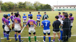 前半は、13分まで相手側のコートで一進一退の攻防を続けました。13分にトライ、コンバージョンゴールを許しましたが我慢強い試合運びができました。一方、後半は終始相手側のコートで試合を展開し、ゴールラインまであと5mに迫ったり、パス回しで崩しワンチャンスあったりと、後半27分にトライを許しはしましたが集中力を切らさず、粘り強く試合を進めることができました。