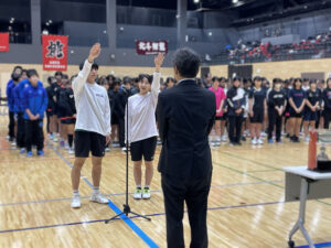 新チームとして初めて学校対抗戦に臨みました。8月の選手権から見えた課題に焦点を当て、練習に励んできた成果が出た大会となりました。大会の開会にあたり、男女主将が選手宣誓を行いました。