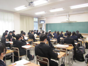 今年も去年に引き続き、新型コロナウイルス感染症予防のため、校内テレビ放送により、各教室で、校長、キャリア教育部長、3年学年主任からの激励を受けました。