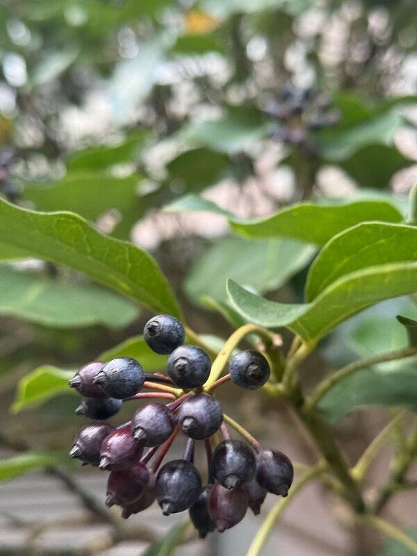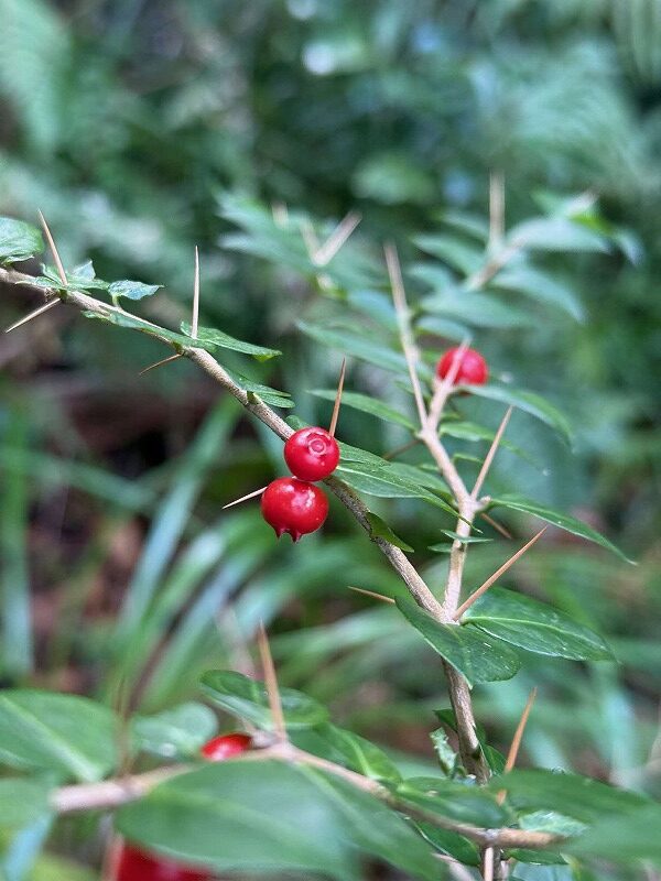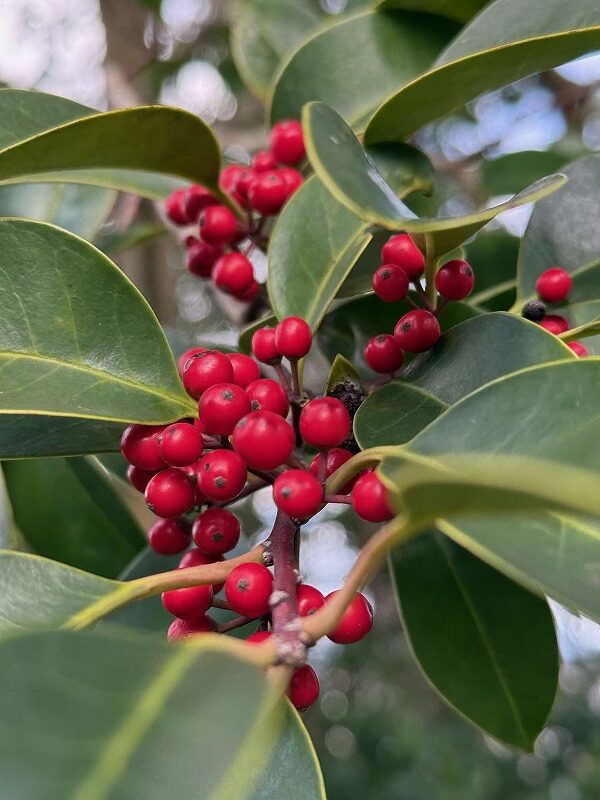 名前の由来は諸説あり、棘が鋭くアリをも突き刺すとか、棘が多くアリでないと通れないなど。また、センリョウ(千両)やマンリョウ(万両)と一緒に植えて「千両万両有り通し」(=年中お金に困らない)と称してお正月の縁起物ともされます。別名はイチリョウ(一両)です。