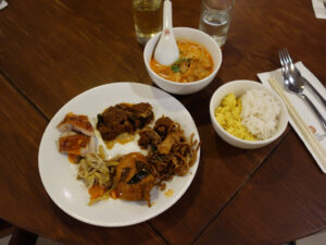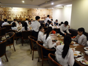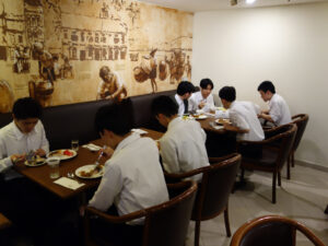 本日の研修もすべて終わり、夕食の時間がやってきました。本日の夕食は「ニョニャ料理」のビュッフェでした。普段食べている日本料理とは全く違う、東南アジアの文化が詰まった料理でした。特に、多くの生徒が噂にしか聞いたことのないドリアンもあり、おいしく感じる生徒もいれば、・・・となる生徒もいました。この研修で最も異文化を感じることができた時間だったように思います。