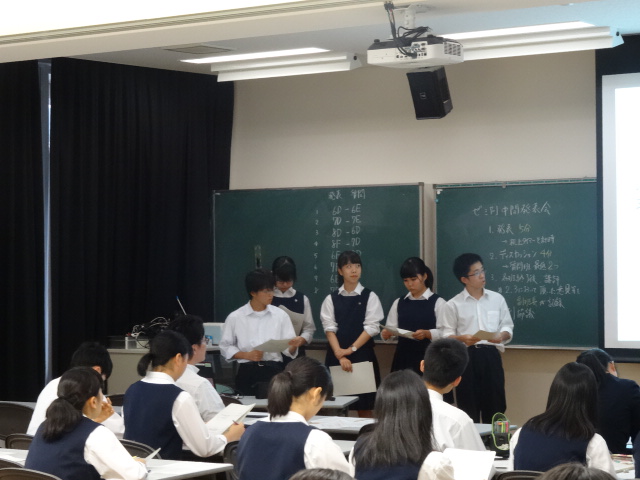 10月11日(木)5・6限に、2年生普通科文系クラスの生徒が「SG探究課題研究」のゼミ別中間発表会を行いました。